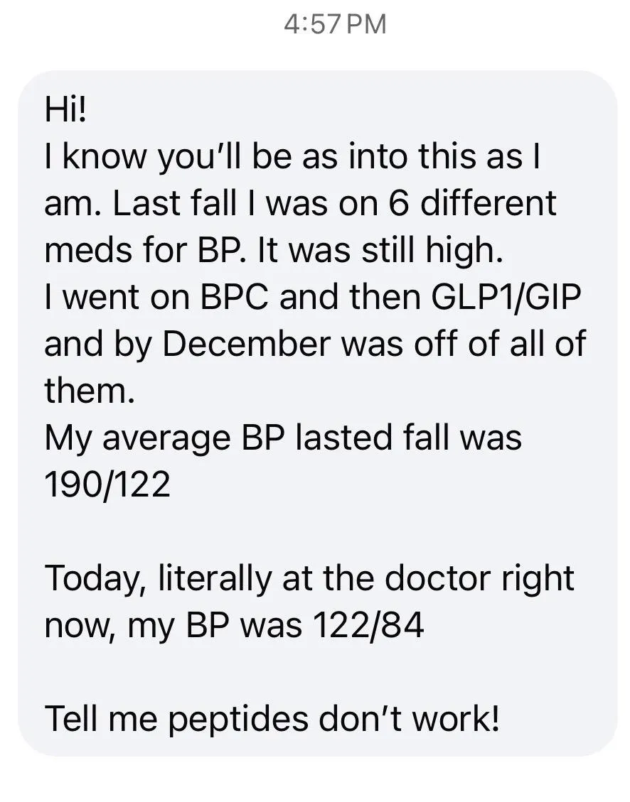 I'm the daughter of a stroke survivor who is the daughter of a stroke survivor. Alzheimer's terrifies me. Within one month of starting peptide therapy, it was like somebody gave me my brain back. My blood sugar finally responded properly. I lost 17 pounds slowly over months—no muscle wasting. Just sustainable change.