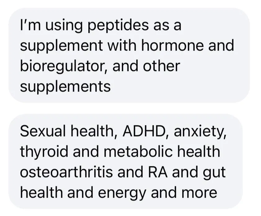 Clean diet, supplements, movement, liver support. I even started HRT. But I still didn't feel like myself. When I learned about the neuroprotective benefits of peptides—not just weight loss—I wanted in.